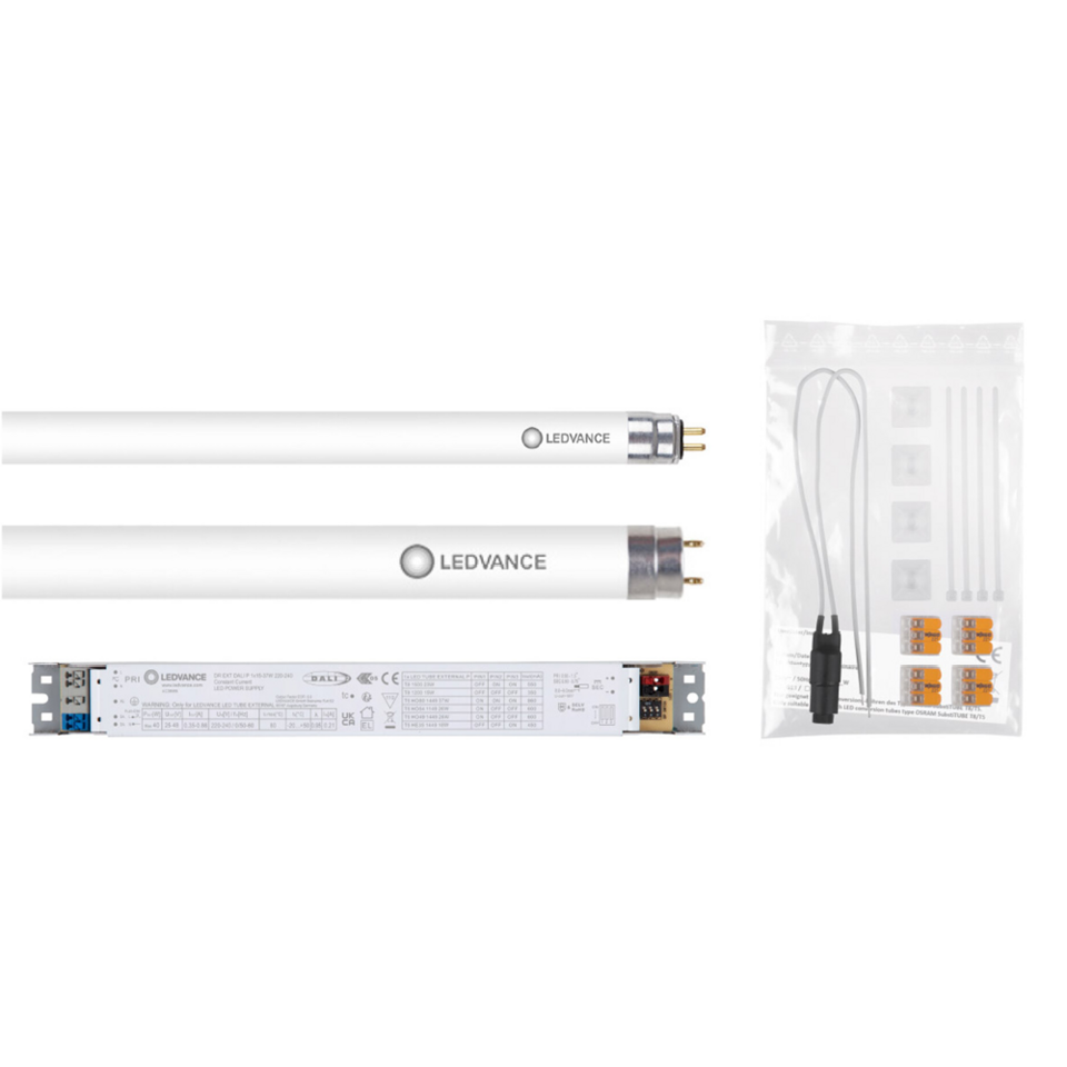 Gibt es keine Retrofit-Alternative oder stehen maximale Effizienz und geringer Wartungsaufwand im Fokus, ist Umverdrahtung die Lösung. Auch hierfür gibt es verschiedene Lösungen. Die perfekte Lösung zur Umstellung einer dimmbaren DALI-Installation auf dimmbare LED-Technologie ist das LED Tube External System aus LED-Röhre und externem Treiber – Ledvance.de/led-tube-external-system